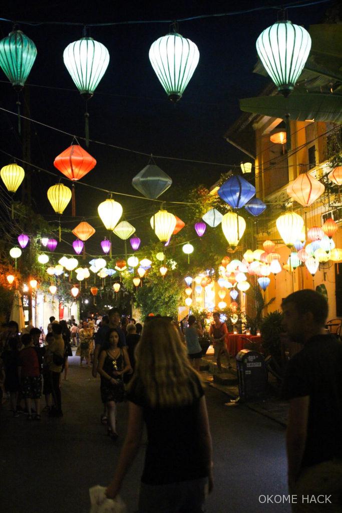 ホイアンでは毎月旧暦の14日に「ランタン祭り」が行われていますが、お祭りではなくても写真のようなランタンのライトアップは行われていました。毎月あるので「ランタン祭り」に行きたい方は日程を調べてからスケジュールを決めると良さそう。