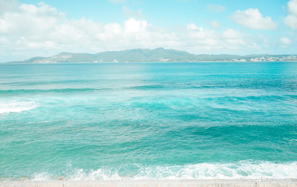荒れていても綺麗なブルーグリーンな海の沖縄。日本海を見慣れてるせいか違いがすごい。最高。